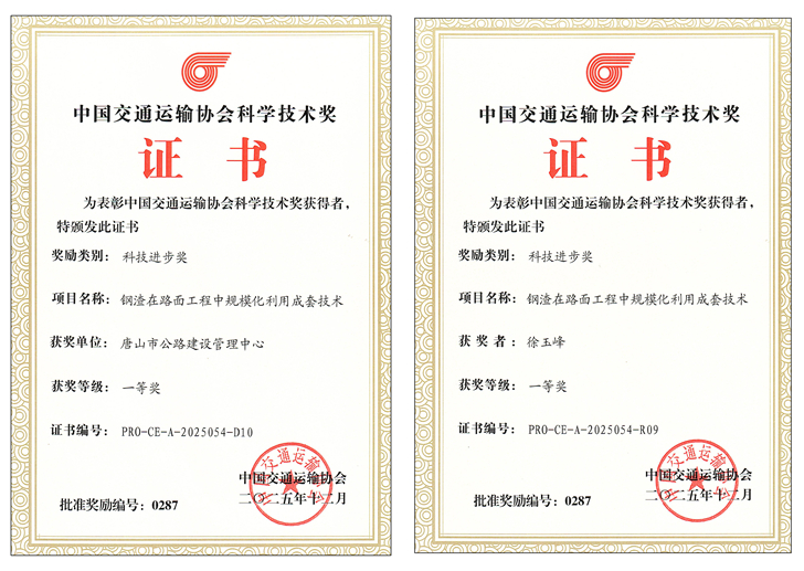 3月29日2025年度中国交通运输协会科学技术奖正式揭晓,唐山市公路学会会员单位唐山市公路建设管理中心参与研发的“钢渣在路面工程中规模化利用成套技术”项目,一举斩获中国交通运输协会科技进步奖一等奖。这一国家级荣誉的取得,标志着唐山在交通建设科技研发领域实现重大突破,为区域绿色交通高质量发展注入强劲科技动能。唐山市公路学会理事长徐玉峰同志作为主要科研带头人,同时获得个人一等奖奖励。