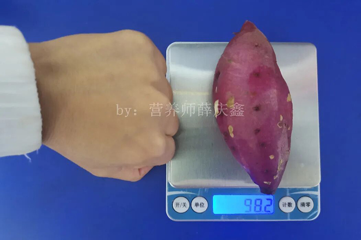 根据《中国居民膳食指南》的推荐,建议每人每天薯类吃50~100克即可,如果选择吃红薯,100克的红薯大约是一般女性1拳头的量,见下图。