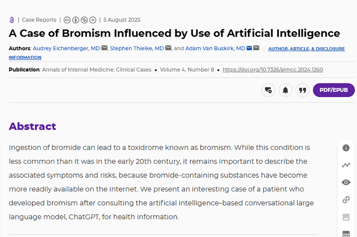 不久前《内科医学年鉴·临床病例》(Annals of Internal Medicine: Clinical Cases)就报道了一起神奇的病例——有人因为听信AI,把自己吃成了多年未见的溴中毒。