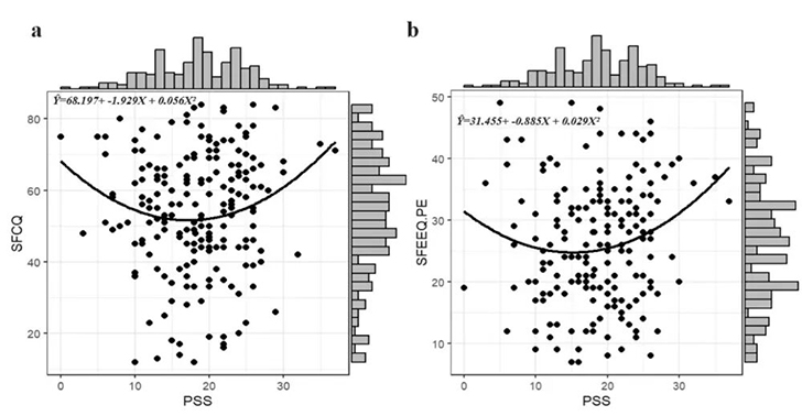 图a:感知压力与吃辣欲望之间的U型关系。图b:感知压力与积极情绪体验之间的U型关系
