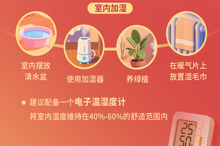 使用加湿器是首选,但一定记得定期清洁,防止“加湿器肺炎”。这里更推荐大家一个简易方法:在暖气片上放湿毛巾,或是在房间角落放一盆清水,通过水分蒸发来自然加湿。