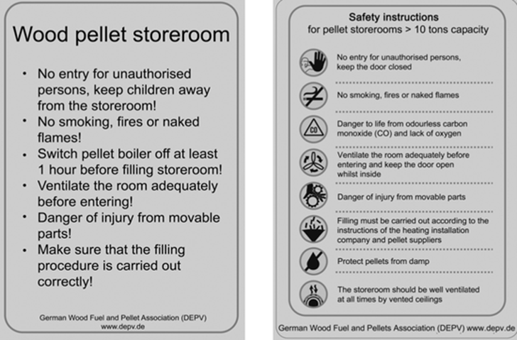 德国木材燃料和颗粒协会(German Wood Fuel and Pellet Association)对进入木颗粒储藏室的人发出的警告,其中明确指出了一氧化碳和缺氧的可能性。图片来源:(DOI)10.1093/anhyg/mes047