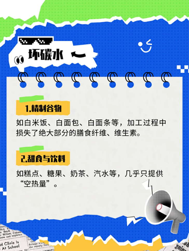 坏碳水多为精加工或添加大量糖的食品。好吃到令人上瘾,但是营养价值低,几乎只提供能量,升糖速度快,易引发血糖骤升骤降,导致“过山车式”的饥饿感,饱腹感差,很容易进食过量。长期大量食用坏碳水,会增加肥胖、糖尿病、心血管疾病等慢性病发生风险。以下几类食物属于此类。