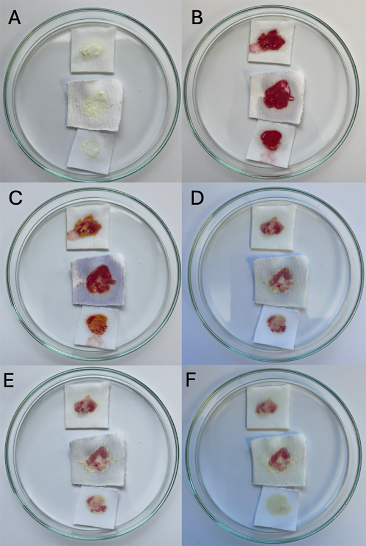 不过,马洪团队推测,这种让衣服变红的化合物很可能并不稳定。为了验证这一点,他们将含有 DHHB 的防晒霜分别涂抹在了氨纶、棉和涤纶等不同面料上,再喷上漂白剂,观察颜色的变化。
