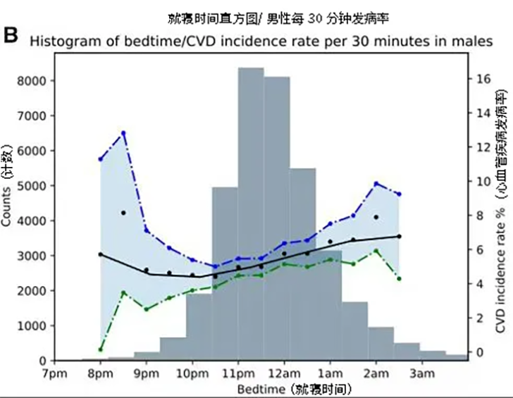 然后,研究人员对他们进行了平均时长为5.7年的随访,发现有3172名(3.58%)被试患上了心血管疾病,包括:心肌梗塞、心力衰竭、慢性缺血性心脏病、中风和短暂性脑缺血发作。这些心血管疾病患者当中,有43%在凌晨及更晚睡,38% 在晚11~12点间睡,而仅有15%在晚10~11点间睡,4%在晚10点前睡。