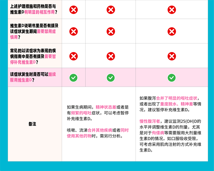 另外,如果生病期间,精神状态差或者是有频繁的呕吐症状,可以考虑暂停维生素 D;咳嗽、流涕合并其他疾病或者同时使用其他药物时,需另行分析。