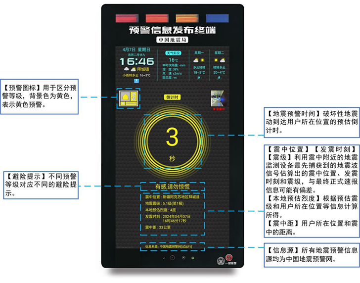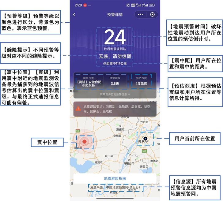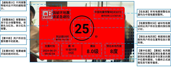 震后发出的地震震级、地震位置、震中距离、地震波到达时间、本地预估烈度、紧急避险等信息。