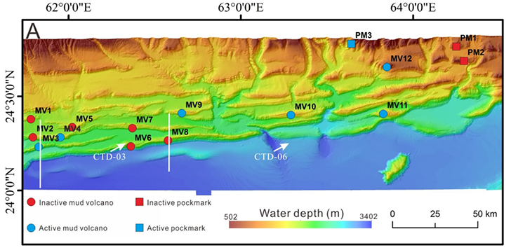 在巴基斯坦的近海大陆边缘,地球采用的是“挤压模式”。2018年,中国地质调查局和巴基斯坦国家海洋研究所对的调查发现,这里有12座海底泥火山整齐地站在东西走向的山脊上,高度从12-121米不等,直径能达到500至1400米。