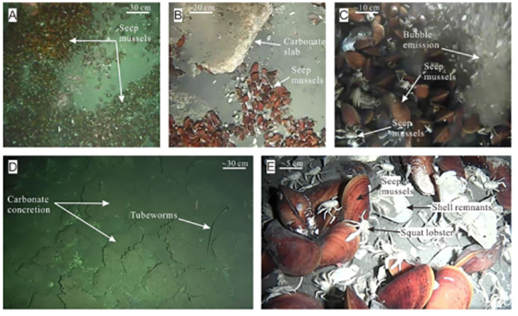 泥火山附近海底观测结果:贻贝(A)、碳酸盐板(B)、气泡释放(C)、碳酸盐结核、管虫(D)、铠甲虾及贝壳残骸(E)(图片来源:(参考文献[2])